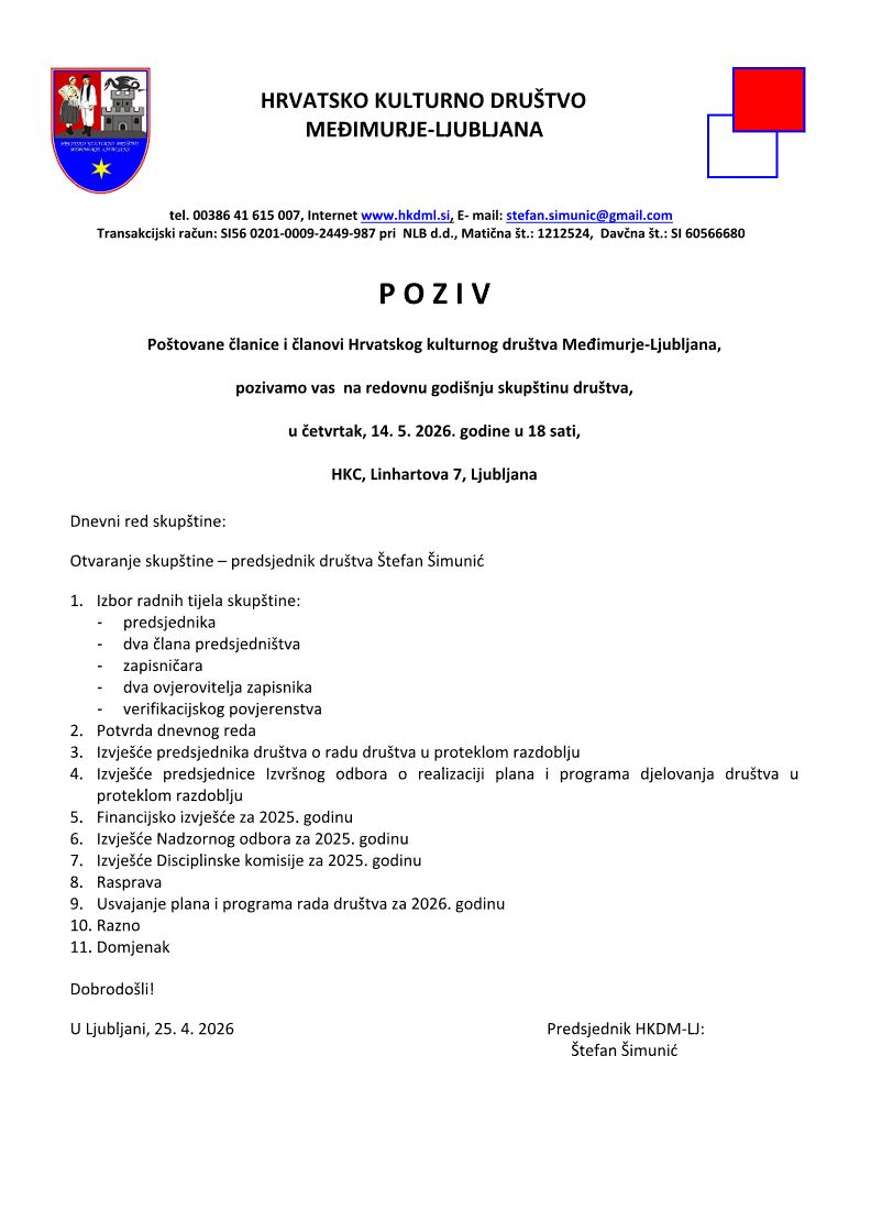 U utorak 17. veljače 2026. godine, u dvorani Belokranjska 6 u Ljubljani održana je vesela i razigrana MAŠKARADA u organizaciji HKD Međimurje-Ljubljana. Ova tradicionalna fašenska večer okupila je brojne članove društva, njihove obitelji i prijatelje, potvrdivši još jednom koliko su zajedništvo i njegovanje običaja važni hrvatskoj zajednici u Sloveniji.